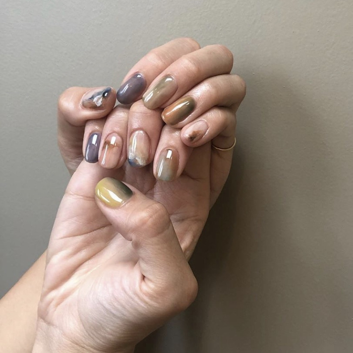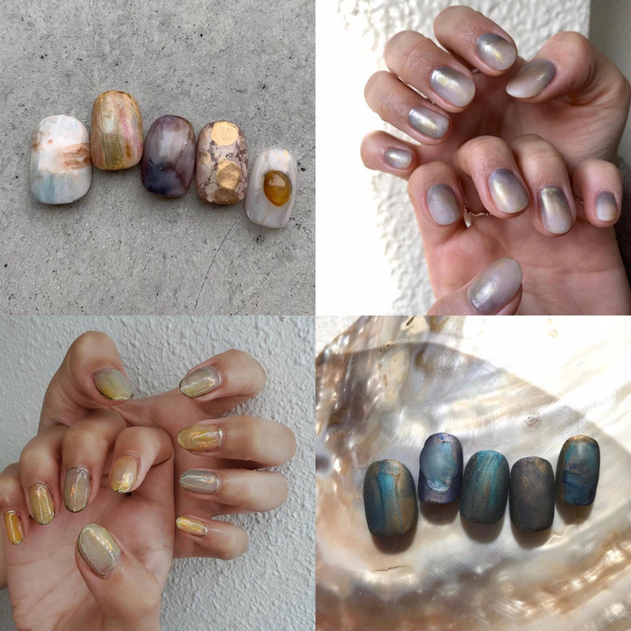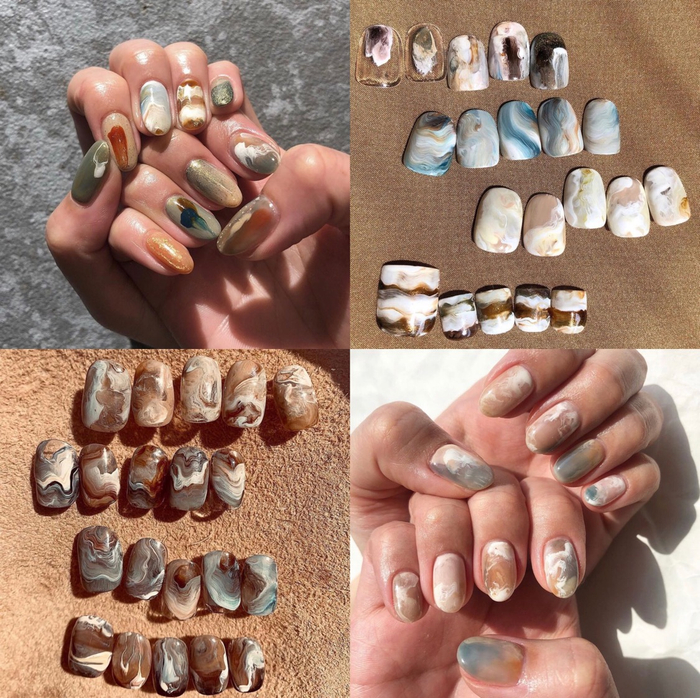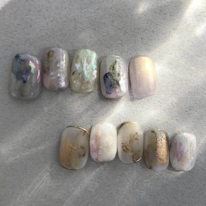 蓝色属于海洋元素,但并不是唯一能体现海洋风景的元素。海滩上温柔的细沙,被海浪卷起的贝壳,被海水冲刷的巨石,这些都能令你感受到海洋的气息。想要打造高级感的美甲款式,就要从某一元素的缩影中寻找细小的灵感。