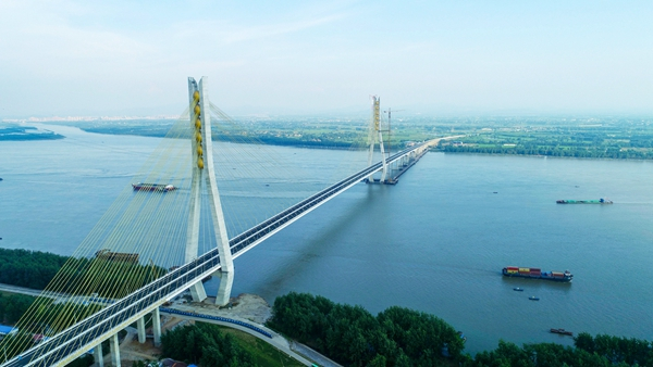 大桥长5.82公里,为不对称混合梁双塔双索面斜拉桥,主跨828米,在国内同类型桥梁中跨度位列第四、安徽第一。大桥采用钢横梁集聚锚锚固技术和皮肤功能混凝土工艺,为国内首创。二航局承建03合同段施工内容包括北主桥、北岸引桥、箱梁预制与安装等,中交路建主要负责的04合同段长2.63公里,包括南主桥、连续刚构桥、连续梁跨堤桥等施工。