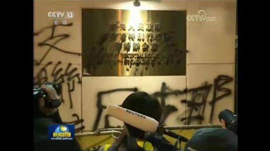 Protesters besieged the Liaison Office of the Central People‘s Government in the HKSAR and defaced the national emblem with black paint at the gate of the liaison office and daubed graffiti with insulting words on the wall。 They damaged surveillance cameras near the building, using umbrellas to avoid identification by surveillance equipment。