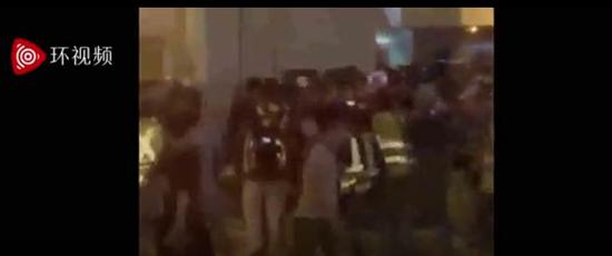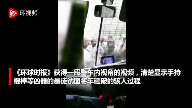 《环球时报》记者收到一段现场视频,视频中显示,两名警察被近百人围住并殴打,还有暴徒向警察投掷不明物体,一名警察挥舞警棍自卫,一名白衣警察则不得已举起手上的枪瞄准暴徒予以警告。在警察被围殴后,外围的暴徒还用激光笔照射,试图使警察丧失防卫能力。