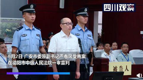 2019年8月2日,四川省德阳市中级人民法院一审公开宣判四川省广安市委原副书记严春风受贿案,对被告人严春风以受贿罪判处有期徒刑十年,并处罚金人民币60万元;对严春风受贿所得财物及孳息,依法予以追缴,上缴国库。严春风当庭表示认罪服判,不上诉。