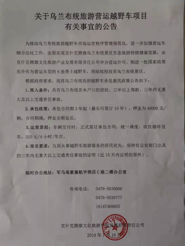 据了解,文旅公司曾经张贴通知,公布投放的400辆越野车经营方式,允许村民租赁经营,租赁期限为三年到十年,押金40000元。至于租金,该通知并未表明,村民告诉新京报记者,租金为每年10000元,“最低期限是三年,也就是说一次性要交70000元,村民租不起”。
