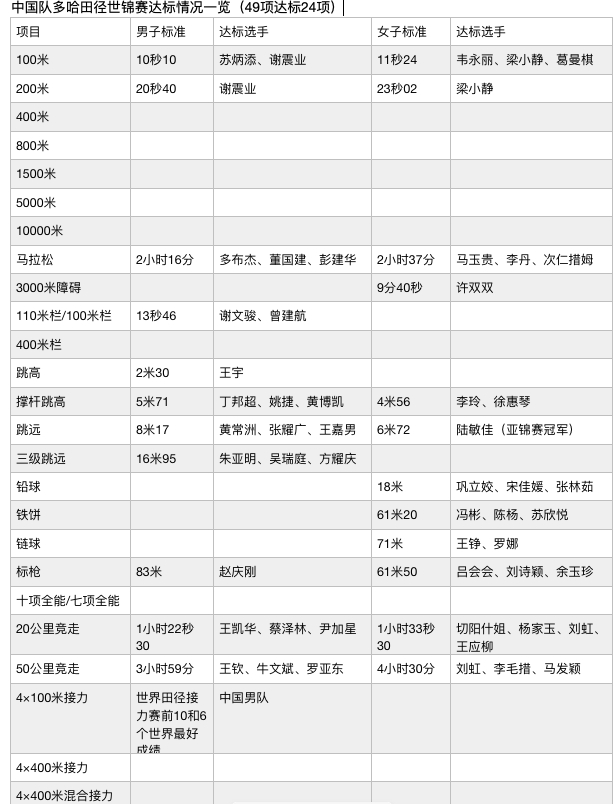 今年田径世锦赛共设49个项目,今晚的选拔赛结束后,中国田径队获得了其中24个项目的参赛资格。