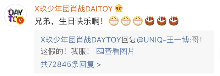 8月5日,一众网友在微博上为《陈情令》主演王一博送上生日祝福,王一博不慎回复了演员肖战的高仿号“X玖少年团肖战DAITOY”,引来本尊亲自下场打假“哥!这是假的”。甚至随后肖战重发微博,并配有与王一博合照以证“真身”。