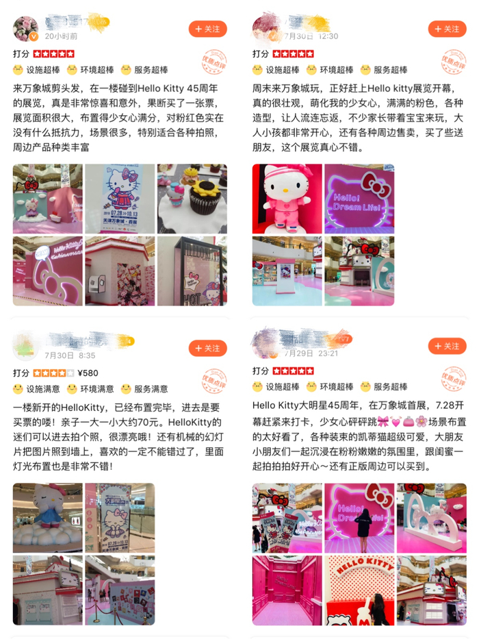 2012年11月,8只Hello Kitty入驻上海大悦城,这被认为是中国内地商场最早的IP展尝试,也正是这一展览掀起了国内购物中心IP活动的热潮,而这些经典的卡通动漫IP似乎永远都不会过时。7月28日Hello Kitty 45周年巡展在中国内地的首展落户天津万象城,开展不过几天时间,就“刷爆”了天津万象城在大众点评的主页。