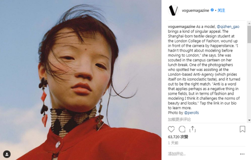 美国版VOGUE在官方社交网站上分享了模特Qizhen Gao的一张照片,引发讨论