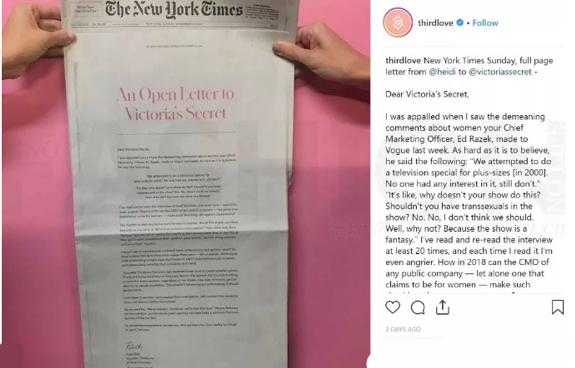 “维密”首席营销官Ed Razek在接受时尚杂志《Vogue》的采访中发表关于大码模特和跨性别模特的争议言论,美国互联网内衣品牌 ThirdLove 利用一整版的纽约时报版面,以公开信的形式抨击了他的言论。