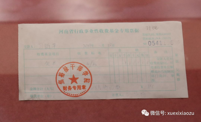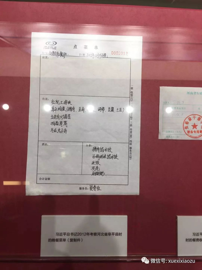 2014年,习近平在兰考考察时的餐费收据,按照当时的收费标准和用餐次数交纳了餐费,合计160元整。