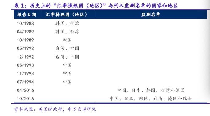 自1988年颁布《贸易和竞争力综合法案》以来,美国财政部每年发布两次汇率报告,就他国对美国的经常账户顺差以及汇率进行评估,判定是否存在汇率操纵行为,并于1988年判定中国台湾和韩国存在“汇率操纵”。1991年,美国发起针对中国的贸易政策调查,并于1992-1994年间将中国列为汇率操纵国。如下图所示: