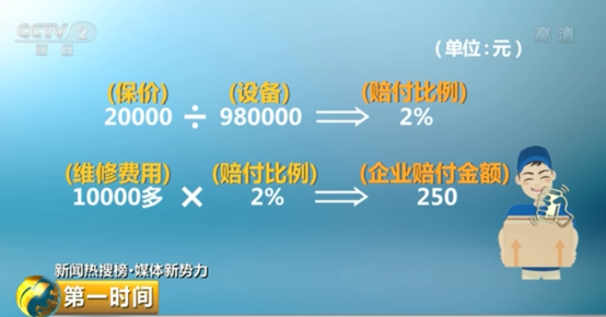 按照客服的说法,2万元保价除以98万元设备,得出赔付比例为2%,而1万多元的维修费用再乘以2%,最终企业需要赔付的金额就是250元。