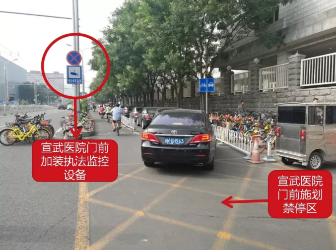 宣武医院门前通过加装执法监控设备与施划禁停区。市交管局供图