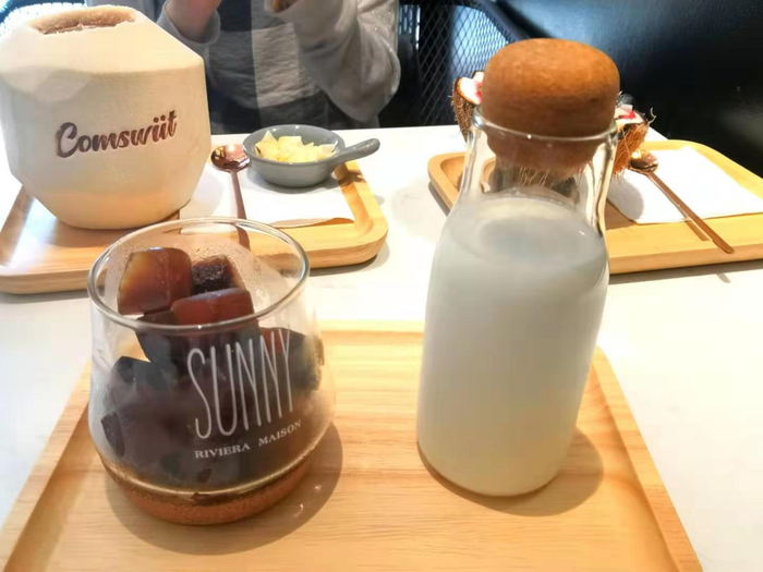 除了椰子制作的甜品,店内的特色饮品也毫不逊色。比如椰风抹茶、冰咖撞奶。