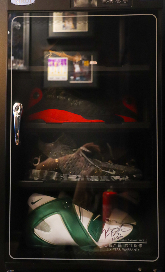 老板解释说,球鞋放置在外面,与空气接触会被氧化,即使是放在密闭透明橱柜里的球鞋,也会因灯光的照射有轻微氧化。在老板收藏的球鞋中,有几双球鞋特别珍贵,分别是乔丹、科比和杜兰特曾在比赛中穿过的,甚至是穿过参加多场比赛的,因此,它们就被存放在恒温箱中,降低氧化对球鞋产生的不良影响。