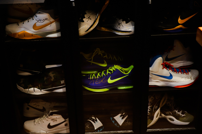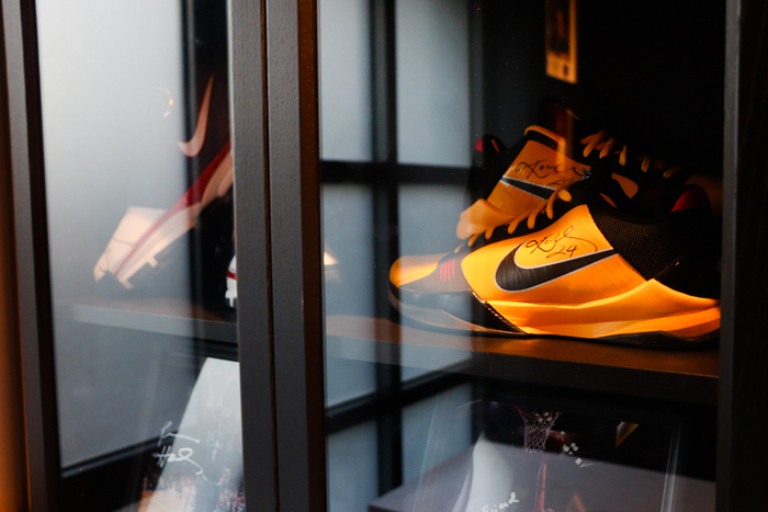 继续往里走,最里面的透明橱柜里整齐地摆放着老板通过各种渠道收集来的球星签名球鞋、书籍、照片等,它们主要是在美国的拍卖网站上竞拍获得,还有部分是球员或经纪人赠送的。比如透明橱柜中间有双球鞋就是在老板过生日时科比亲自送给他的,上面写了“生日快乐”。摆放在橱柜顶层最右端的那双黑色AJ17也非常特别,因为其中一只上面有乔丹的签名,而另一只则是克里斯•保罗的签名。