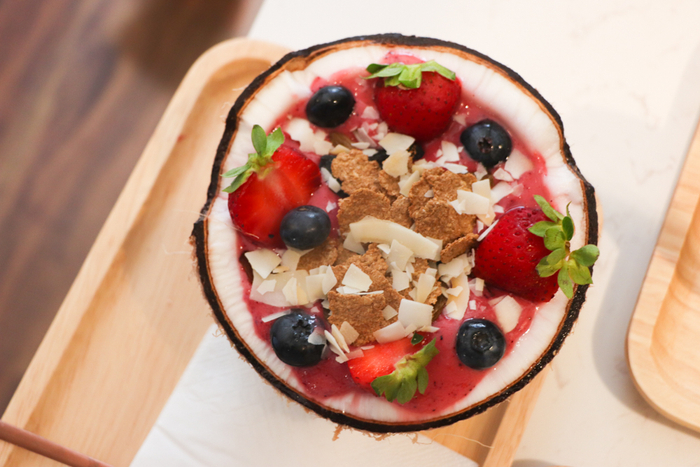 京蜜品尝的杂莓口味的“椰子果昔碗”里,是用各种“莓”混合在一起制成的果泥,当然这些“莓”也会用作装饰。草莓、蓝莓和树莓,这几种莓果交织在一起,酸酸甜甜,那种清新怡人的感觉,仿佛是身处厦门鼓浪屿向远处眺望,微凉的海风扑面而来。