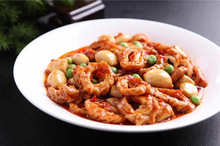 峨嵋酒家的腊八蒜烧川北肥肠首先要将肥肠煮熟,改斜片,上热油锅炸制金黄;再将蒜子放入米醋泡至碧绿色。最后放豆瓣酱、泡椒、葱姜蒜末爆香,加入店内特制的高汤,将肥肠、蒜子放入收汁。肥肠鲜嫩,微咸微辣,口味独特。