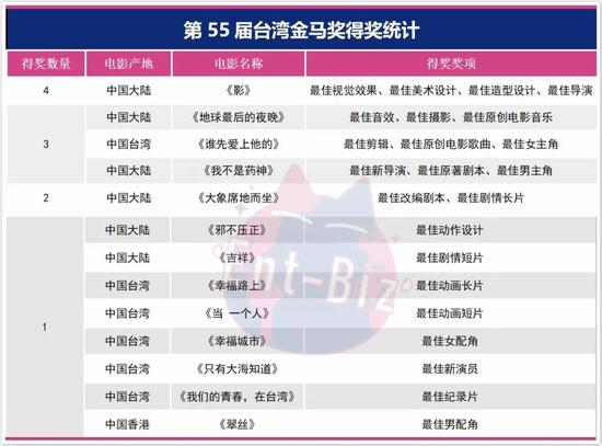 据了解,在去年的第55届台湾金马奖,23个影片奖项及个人奖项当中,6部中国大陆电影获得14座奖项,占比超61%。