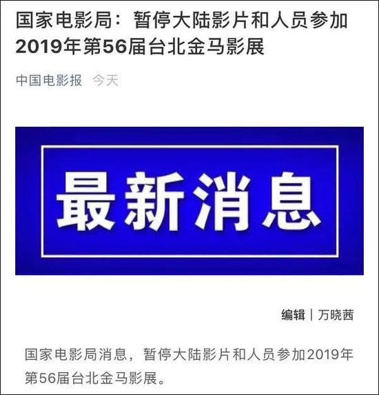国家电影局消息,暂停大陆影片和人员参加2019年第56届台北金马影展。