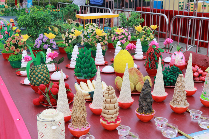 作为整个乞巧文化节的重头戏,贡案学问不小。参与乞巧文化节活动筹备的工作人员告诉记者,七夕贡案主体大致分为四个部分:一是斋菜果品,包括茶酒斋饭、斋菜、金猪、羹汤、时果等,是传统祭祀的必需品,意请“七姐”下凡享用;二是工艺展示,主要是展示人们用谷粒、米粒、瓜子、彩纸、彩布、泡沫、胶片、珠片、珠粒等农作物和生活用品制作的传统手工艺品,如以开心果壳制腊梅,白米砌菊花,洋葱衣做莲花,以鸡蛋壳制灯,以胶片、泡沫制香蕉和火龙果,以绒线织荔枝、葡萄,以染色灯芯做风烛,蚬壳粉制芙蓉吐蝶花,红瓜子做樱桃花,以及手绣小花鞋等。