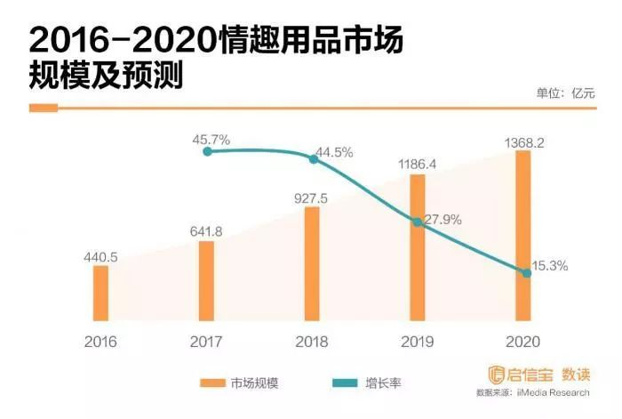 统计显示,2016年至2019年的四年间,情趣用品的市场规模不断扩大,预计2020年能突破1368.2亿元。不过,从增长率来看,却呈现逐年下降的趋势,2017年的市场增长率达45.7%,但今年已经下降至27.9%,预计2020年将继续下降。