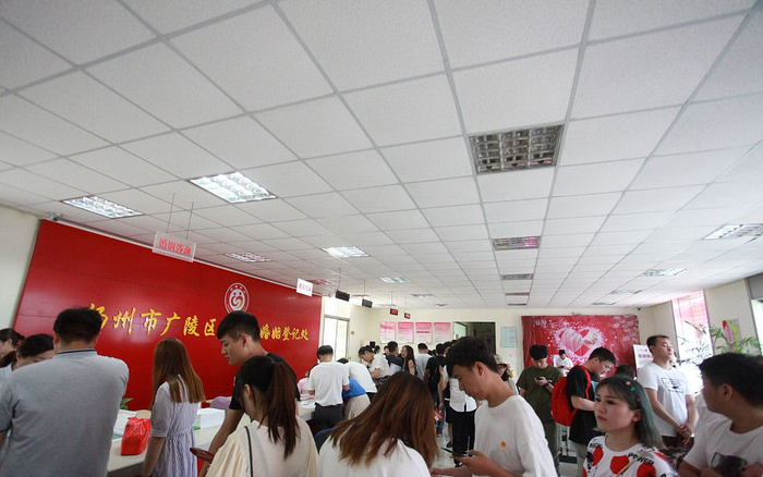 8月7日,江苏扬州市广陵区民政局婚姻登记处,情侣扎堆登记结婚。图/视觉中国