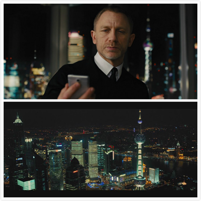 邦德抵达上海之后,有取景上海浦东国际机场,还与对手在延安高速公路上展开了追车戏。邦德与杀手在金茂大厦高空展开贴身肉搏,航拍的陆家嘴的夜景特别美。
