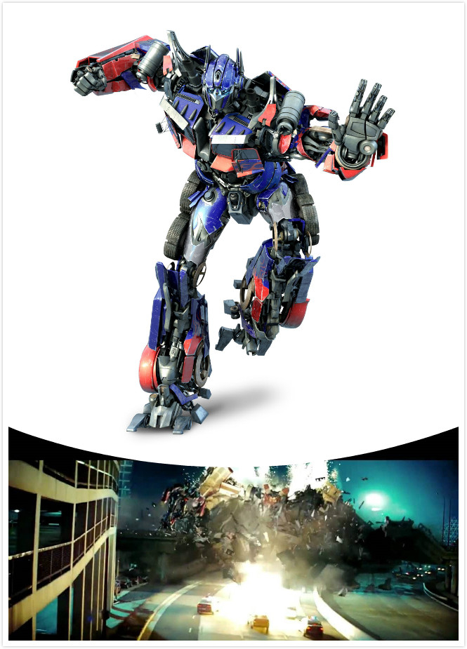全片第一场重头戏就在上海打响,在长达15分钟的上海戏份中,擎天柱跟堕落金刚从写有“帝国进出口公司”的上海钢铁厂打到淮海路、东方明珠塔、雁荡路。擎天柱顺着东方明珠电视塔往下一边降落一边变形,十分帅气。不过,导演迈克尔·贝并没有选择在中国实拍,而是在美国宾夕法尼亚州一间钢铁厂遗址,设计成一个虚拟的中国钢铁基地,又将加利福尼亚州长滩的奎恩斯威立交桥营造成中国上海夜晚街头的虚拟片景,拍摄了多组爆炸场面的特技车戏。
