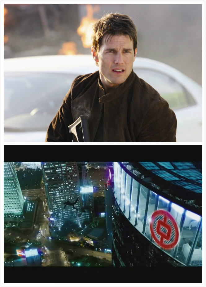 片中最惊险的一幕就发生在陆家嘴。汤姆·克鲁斯从中国银行大楼的楼顶一跃而下,顺着几百米高的楼外玻璃墙向楼底急速坠下,不仅动作惊险刺激,还将陆家嘴的夜景完美展现给观众。