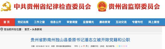2018年10月,潘志立被立案审查。2019年1月,潘志立被立案调查。记者注意到,中央贵州省纪检委网站8月1日消息显示,潘志立被开除党籍和公职。