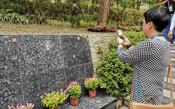 凤凰山公墓,参观者用手机扫描铭牌二维码,了解逝者生平。摄影/新京报记者 马瑾倩