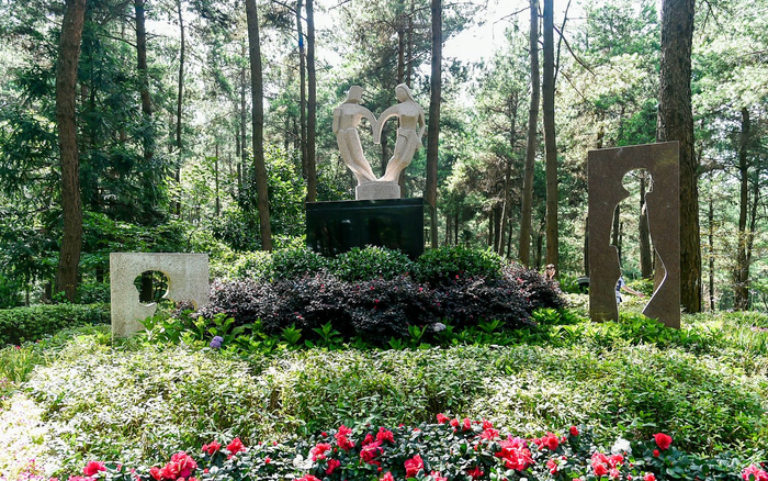凤凰山公墓的花坛葬,三座雕塑象征人的一生。