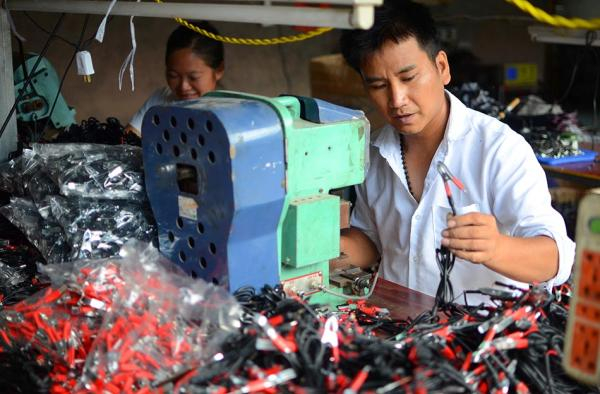 2019年7月24日,贵州黔东南,高寨村群众(贫困户)正在锦屏县艺贵仁电子厂生产数据线。近年来,贵州黔东南州锦屏县鼓励农村能人在全县15个乡镇建立适合当地实际的“扶贫车间”28个,解决了百余名当地群众(建档立卡贫困户)实现家门口就业。 视觉中国 图