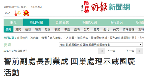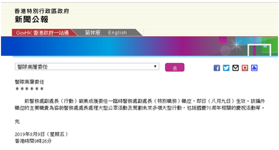前警务处副处长(行动)刘业成获委任一临时警务处副处长(特别职务)职位,即日(八月九日)生效。该编外职位的主要职责为协助警务处处长处理大型公众活动及策划未来多项大型行动,包括国庆70周年相关的庆祝活动等。