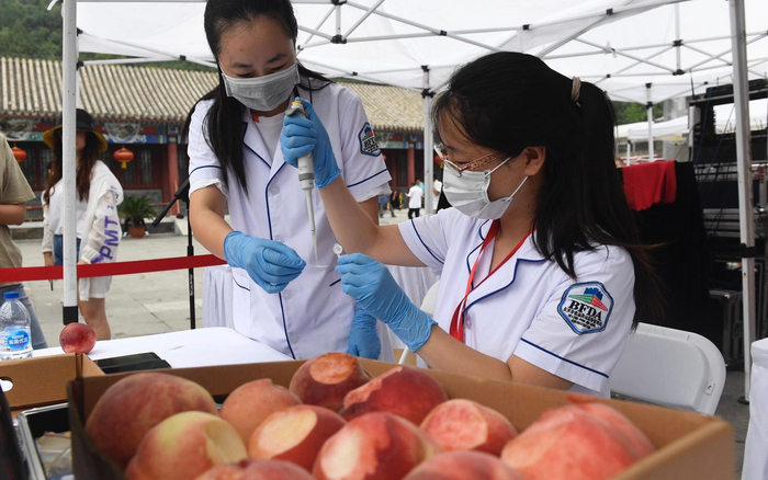平谷区食药监局的工作人员在现场对大桃进行农药残留检测,在抽检20份大桃中全部合格。摄影/新京报记者 吴宁