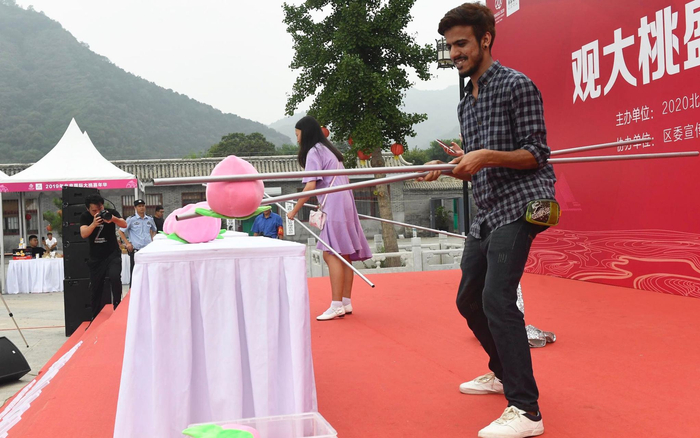 游客在参与夹桃子比赛,一位外国朋友也上台一试身手。摄影/新京报记者 吴宁