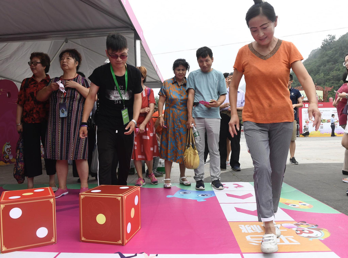 游客参与“大桃跳一跳”游戏。摄影/新京报记者 吴宁
