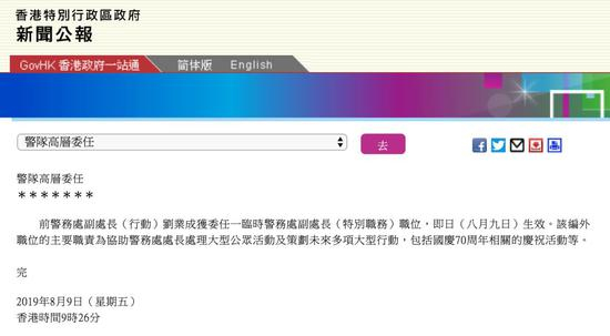 今天(9日)上午,香港警务处宣布,前警务处副处长(行动)刘业成获委任为临时警务处副处长(特别职务),即日生效。