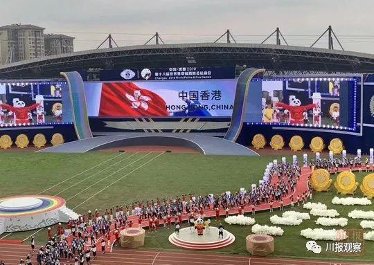 当中国香港警队入场时,现场大屏上出现了鲜红的香港特别行政区区旗,飘扬的紫荆花和“中国香港”四个大字异常醒目。