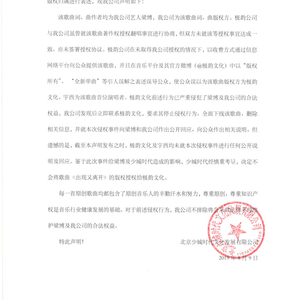 新京报讯(记者 杨畅)8月9日,梁博经纪公司少城时代发表声明称,歌手宇西未经授权翻唱梁博的歌曲《出现又离开》:“极韵公司与我公司虽曾就梁博《出现又离开》的著作权授权翻唱事宜进行协商,但双方未就授权事宜达成一致。极韵公司以付费形式向公众提供该歌曲、并以‘版权所有’、‘全新单曲’等引人误解之表述误导公众,严重侵犯了梁博及公司的合法权益,我公司要求其停止侵权行为、全面下线该歌曲、删除相关信息,并就本次侵权事件向梁博和我公司作出公开回应、向公众作出相关说明。”