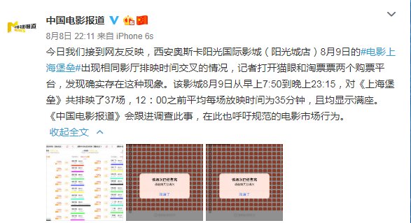 8月8日,中国电影报道官方微博又点名《上海堡垒》。报道称,西安奥斯卡阳光国际影城(阳光城店)8月9日的《上海堡垒》出现相同影厅排映时间交叉的情况。该影城8月9日从早上7:50到晚上23:15,对《上海堡垒》共排映了37场,12:00之前平均每场放映时间为35分钟,且均显示满座。