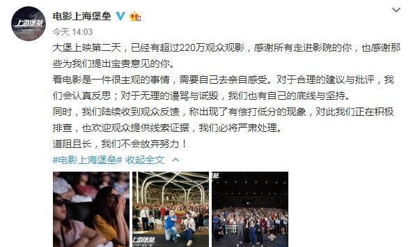 今天(8月10日)下午,《上海堡垒》官微表示,“看电影是一件很主观的事情,需要自己去亲自感受。对于合理的建议与批评,我们会认真反思;对于无理的谩骂与诋毁,我们也有自己的底线与坚持。同时,我们陆续收到观众反馈,称出现了有偿打低分的现象,对此我们正在积极排查,也欢迎观众提供线索证据,我们必将严肃处理。”