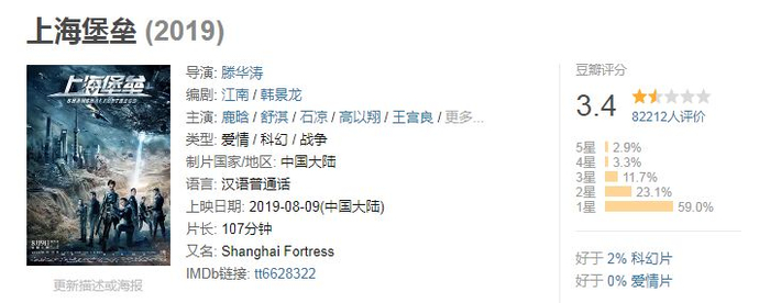 8月9日,由鹿晗、舒淇主演的科幻电影《上海堡垒》上映,但口碑、票房均不尽人意。截至发稿,该片豆瓣评分已降至3.4分,有59%的用户给出1星评价。