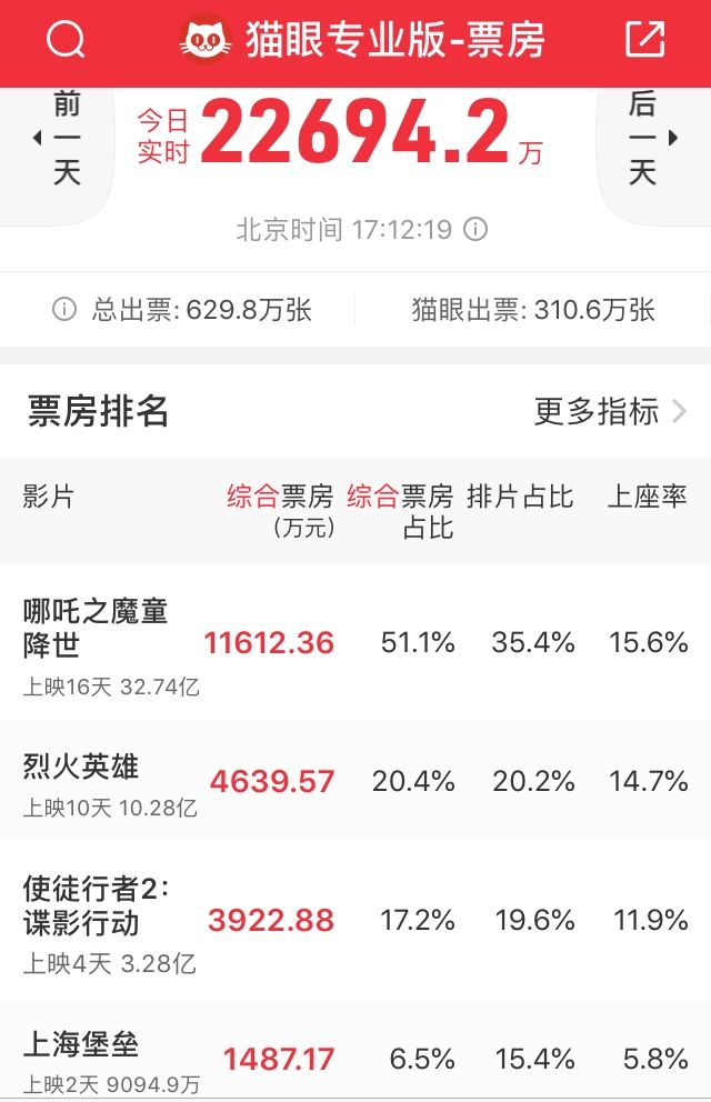在上映的第一天(8月9日),《上海堡垒》似乎还是有救的:两小时票房破6000万,超过《哪吒》;首日票房7400万,逊于《哪吒》。虽然《哪吒》已经上映15天、进入生命周期尾声,但毕竟是今年的现象级大片,《上海堡垒》略微跑输它,不算丢人。