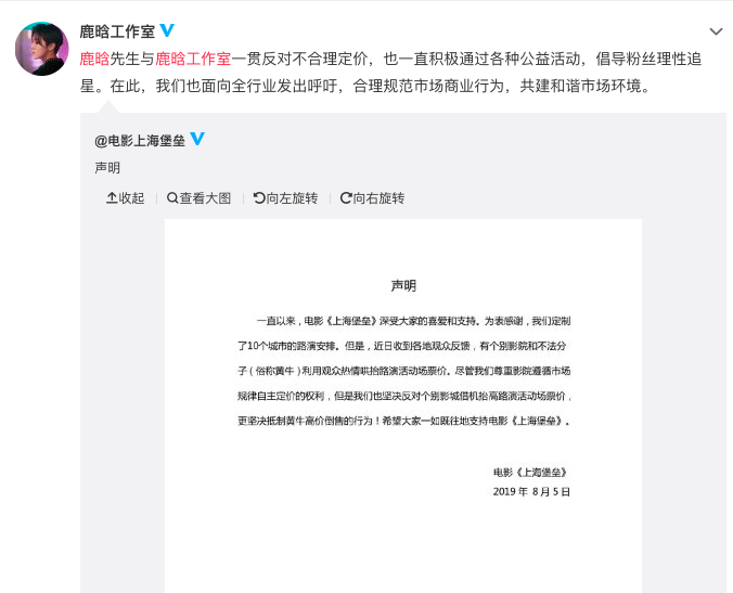 随后“鹿晗工作室”也转发了该声明并表示,一贯反对不合理定价,也一直积极通过各种公益活动,倡导粉丝理性追星。