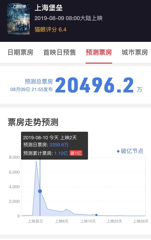 可是到了8月10日,一切都原形毕露了:截止发稿,《上海堡垒》的排片占比15.4%、上座率只有5.8%,票房占比远远低于排片占比——各大影院肯定会纷纷调低排片场次。猫眼专业版的票房预测在8月8日晚是3.66亿元,8月9日晚降低到了2.05亿。