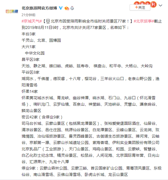 #京城天气#[[话筒]北京市因受降雨影响全市临时关闭景区77家!]#北京旅事#截止到2019年8月11日9时,北京市共计关闭77家景区,名单如下: