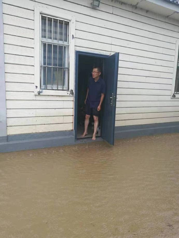 下图为10日中午,受强降水影响,寿光境内弥河水位上涨,山东省寿光市气象局观测站被淹,工作人员紧急调离设备物资。