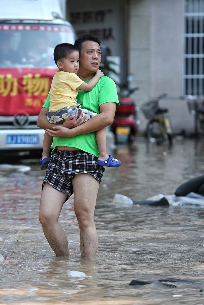 8月11日,浙江临海回浦路,一位家长抱着孩子在积水路段行走。