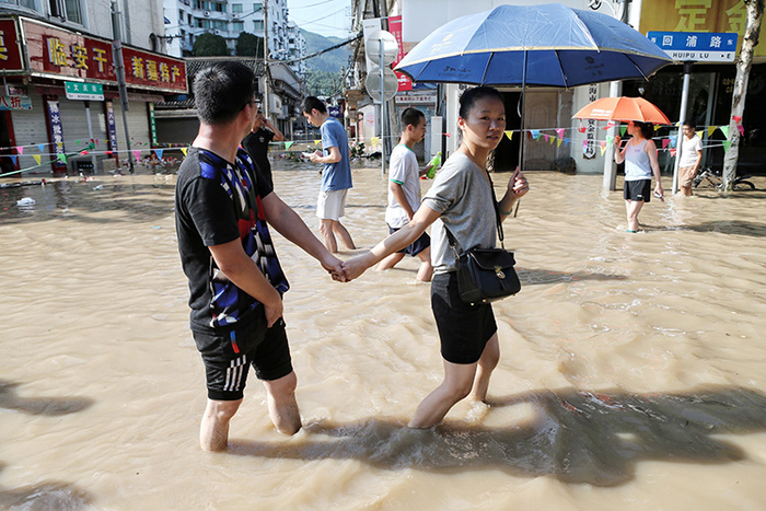 8月11日,浙江临海回浦路,居民在积水路段手牵手行走。