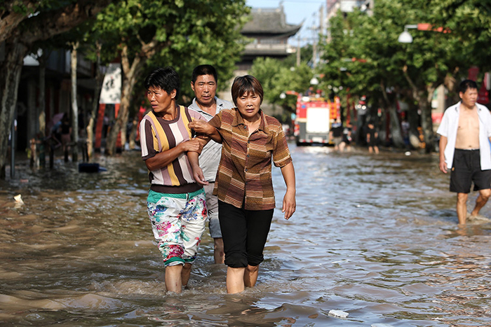 8月11日,浙江临海古城变成一片“泽国”,居民在回浦路积水路段行走。